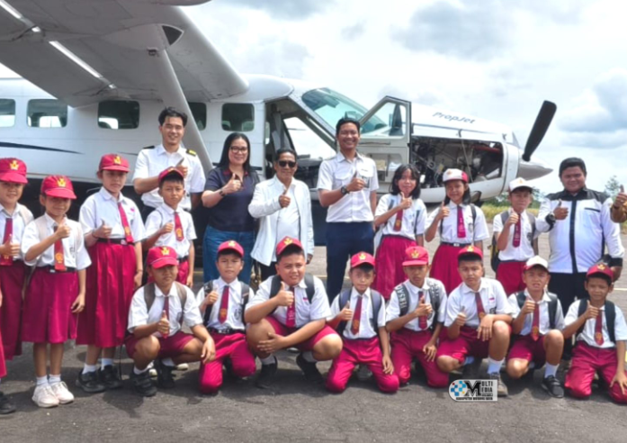 Tampak setibanya di bandara, Bupati Mura dan istri disambut antusias pelajar SD Negeri Oreng yang juga sekaligus ingin melihat secara dekat dan mencoba bagaimana rasanya di dalam pesawat.